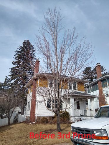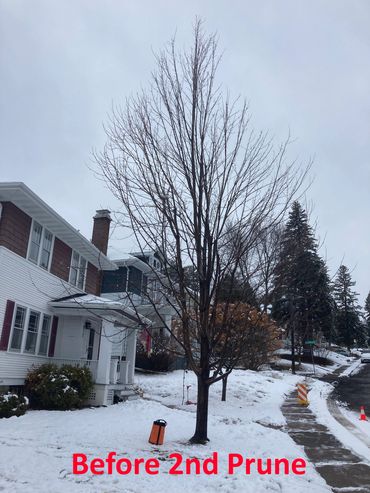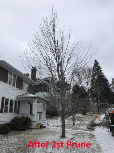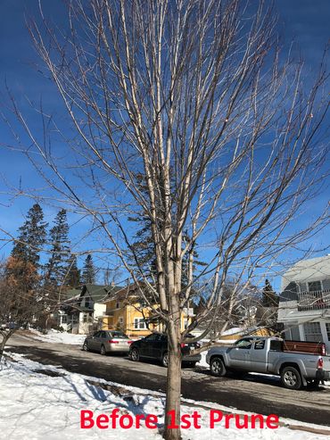 When pruning a tree it is important to think about the process of developing the permanent canopy. A young tree has a temporary canopy and develops a permanent canopy as it matures. It is important to keep temporary branches small in diameter to reduce wound size when removed. Throughout the life of the tree, promote and maintain a dominant leader. Once the tree is mature, use reduction cuts to suppress aggressive branches, keeping leverage, weight and drag low to reduce the chance of failure in storms.